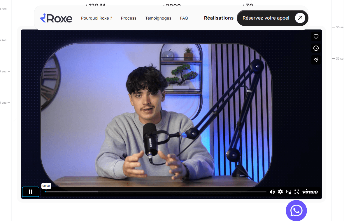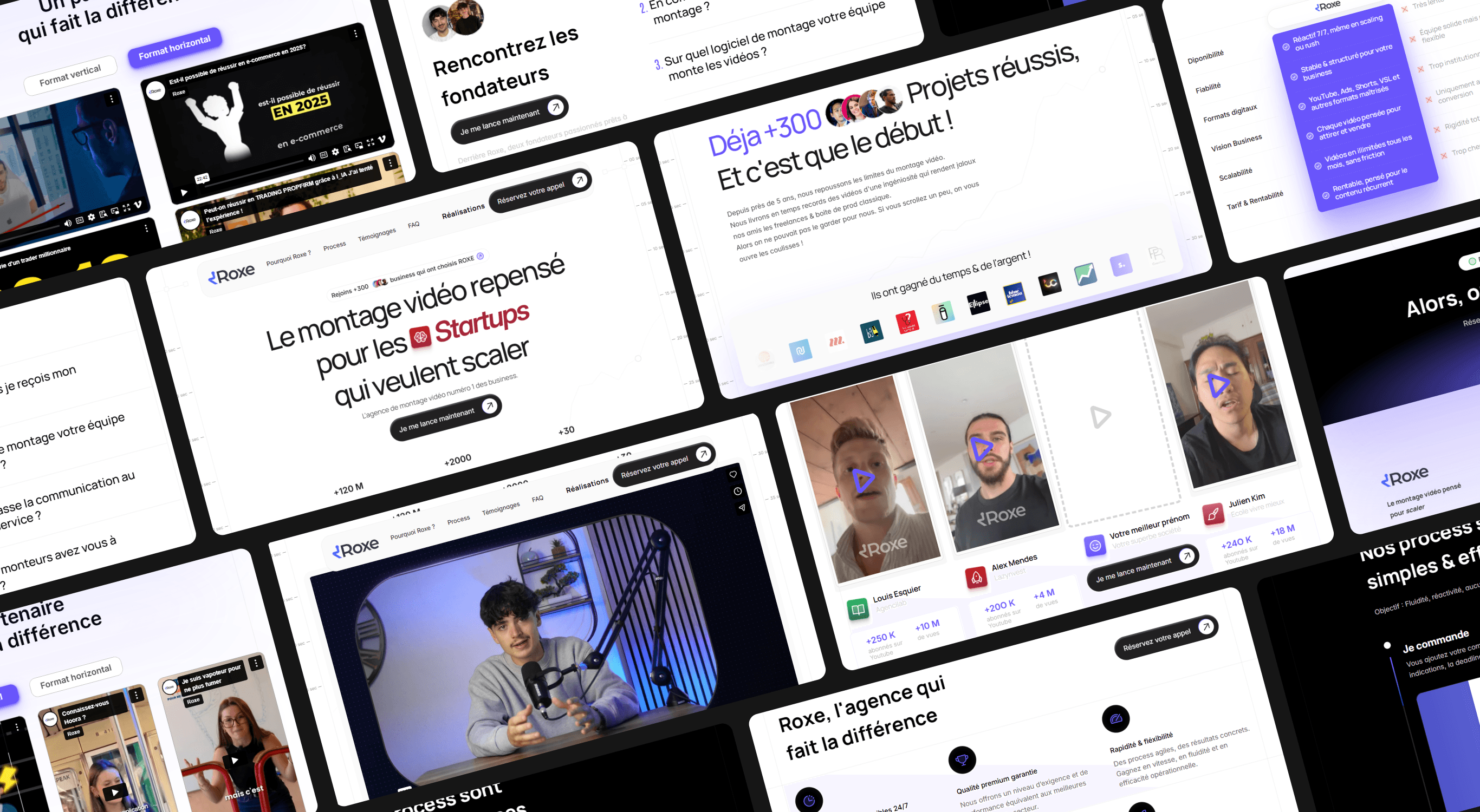 Roxe, c’est une équipe de plus de 30 monteurs et plus de 200 réalisations clients, notamment pour des infopreneurs et créateurs à forte audience. Pourtant, leur ancien site donnait l’image d’une agence “banale” : identité peu marquée, architecture confuse, expérience ralentie par un grand volume de vidéos mal optimisées. Aucun tracking n’était en place, impossible de mesurer l’impact réel du site sur le business. En 2025, Robin & Ewen veulent “exploser” et s’imposer comme une agence de référence : il leur fallait une vitrine à la hauteur, capable de soutenir cette montée en gamme.