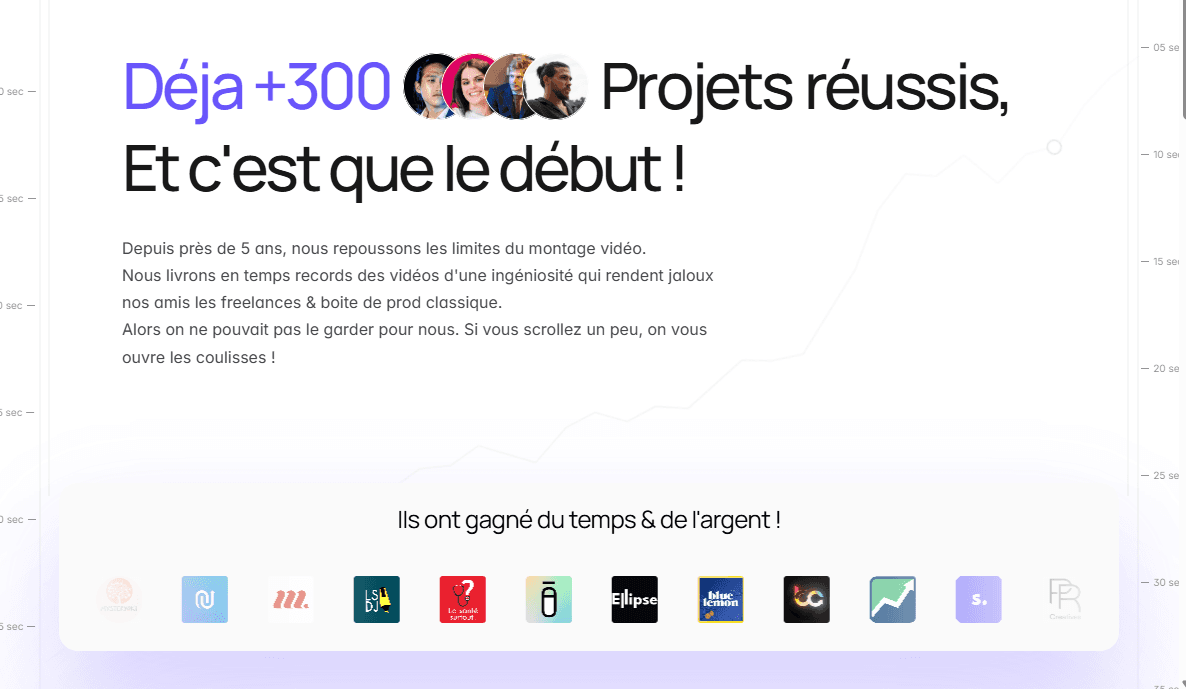 • Une home qui pose immédiatement la promesse : agence de montage vidéo efficace, qualitative, autonome.