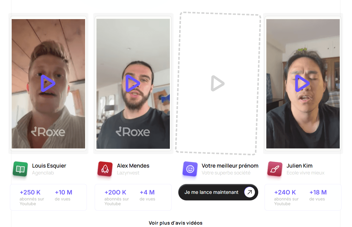 • Des blocs de réassurance forts : logos clients, avis vidéo, preuves sociales mises en avant.